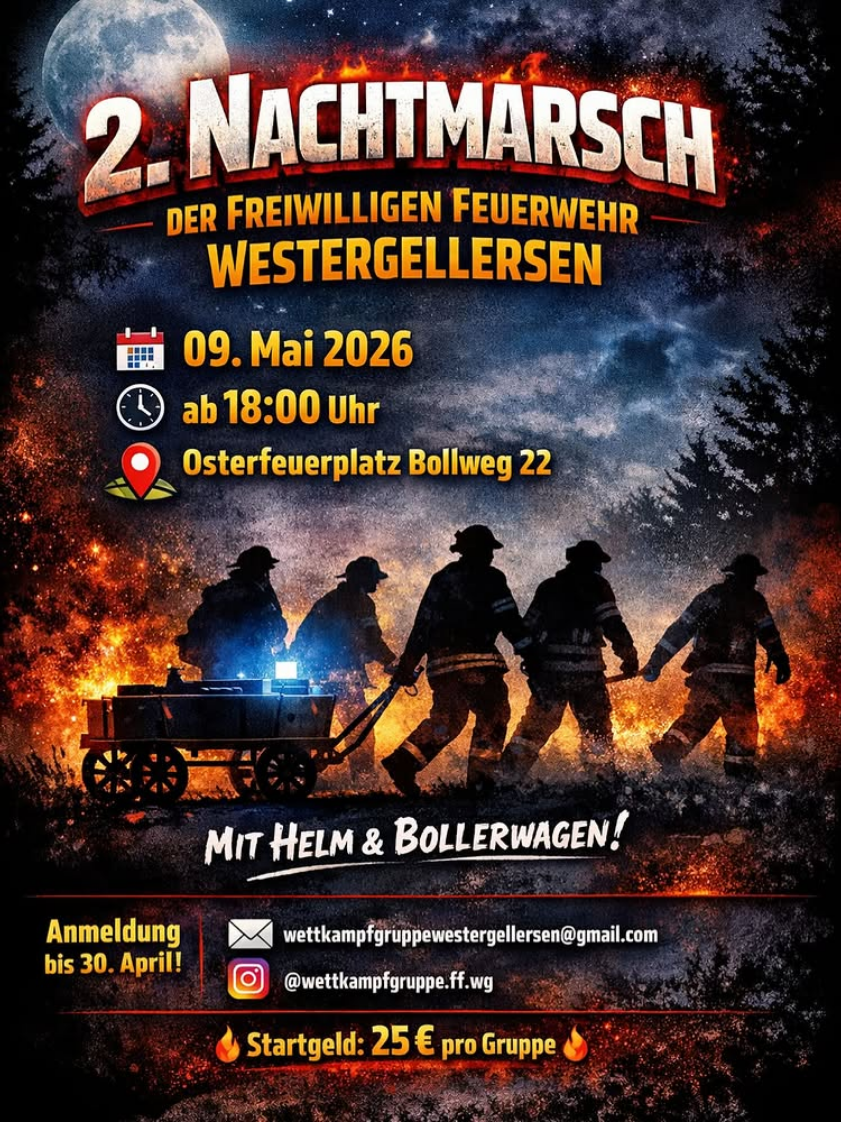 Die Freiwillige Feuerwehr Westergellersen veranstaltet am Samstag den 09 Mai 2026 für aktive Feuerwehren einen 6km langen Nachtmarsch rund um Westergellersen.